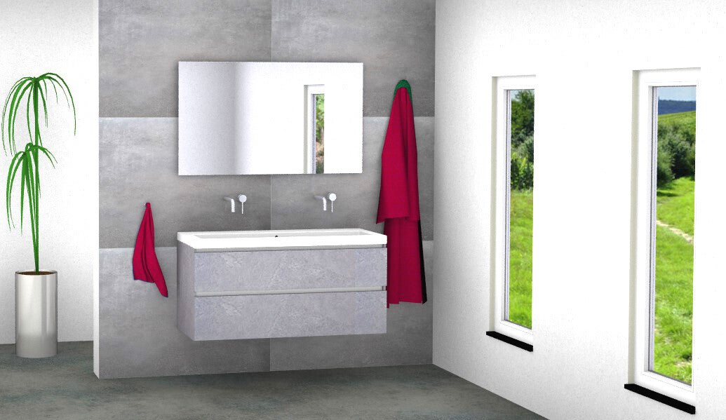 Vision 120 cm greeploos badmeubel kleur beton grijs met keramisch jazz blad en standaard spiegel (kraan niet inbegrepen).