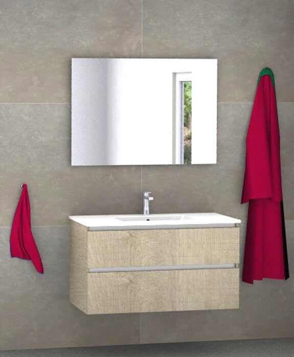 Vision 100 cm greeploos badmeubel kleur stone oak met keramisch blad 1,5 cm en standaard spiegel (kraan niet inbegrepen).