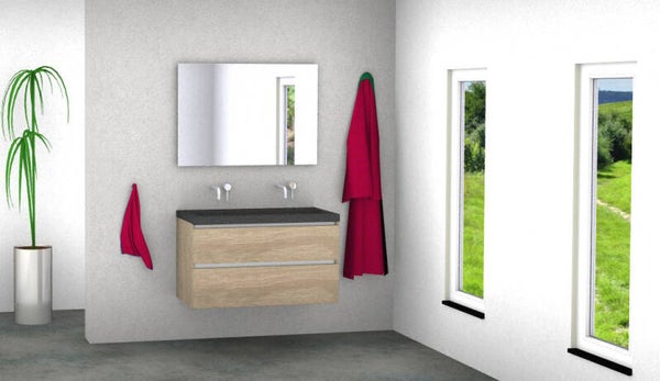 Vision 100 cm greeploos badmeubel kleur bardolino eik met natuursteen blad ca. 5 cm en standaard spiegel (kraan niet inbegrepen).