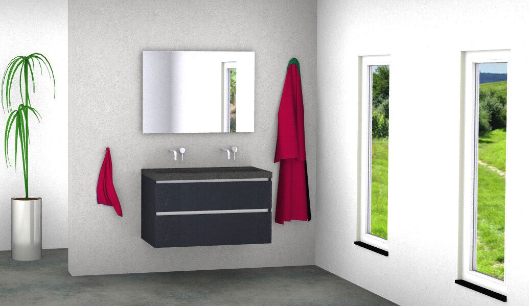 Vision 100 cm greeploos badmeubel kleur mat zwart met natuursteen blad ca. 5 cm en standaard spiegel (kraan niet inbegrepen).