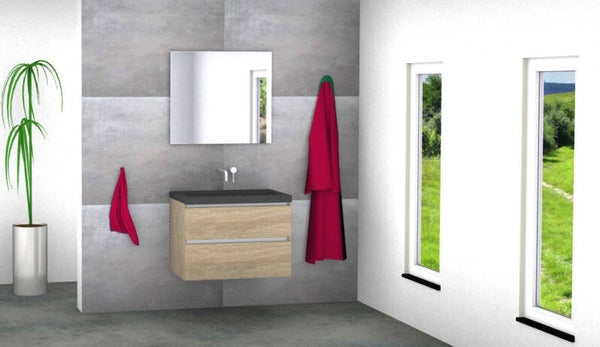 Vision 80 cm greeploos badmeubel kleur bardolino eik met natuursteen blad ca. 5 cm en standaard spiegel (kraan niet inbegrepen).