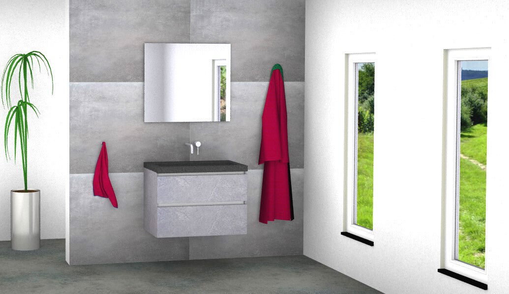 Vision 80 cm greeploos badmeubel kleur beton grijs met natuursteen blad ca. 5 cm en standaard spiegel (kraan niet inbegrepen).
