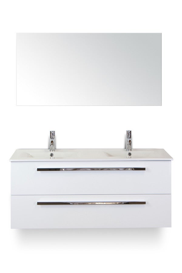 Amanda badmeubel 120 cm leverbaar in 6 moderne kleuren gecombineerd met een dun keramisch wastafelblad en standaard spiegel (kraan niet inbegrepen).