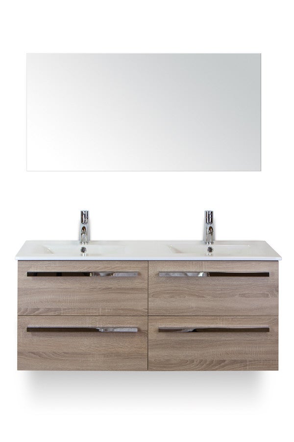 Amanda badmeubel 120 cm leverbaar in 5 moderne kleuren gecombineerd met een dun keramisch wastafelblad en standaard spiegel (kraan niet inbegrepen).