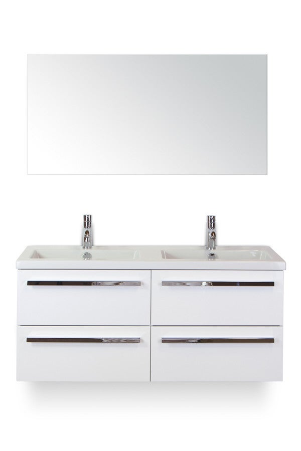 Amanda badmeubel 120 cm leverbaar in 5 moderne kleuren gecombineerd met een keramisch jazz wastafelblad en standaard spiegel (kraan niet inbegrepen).