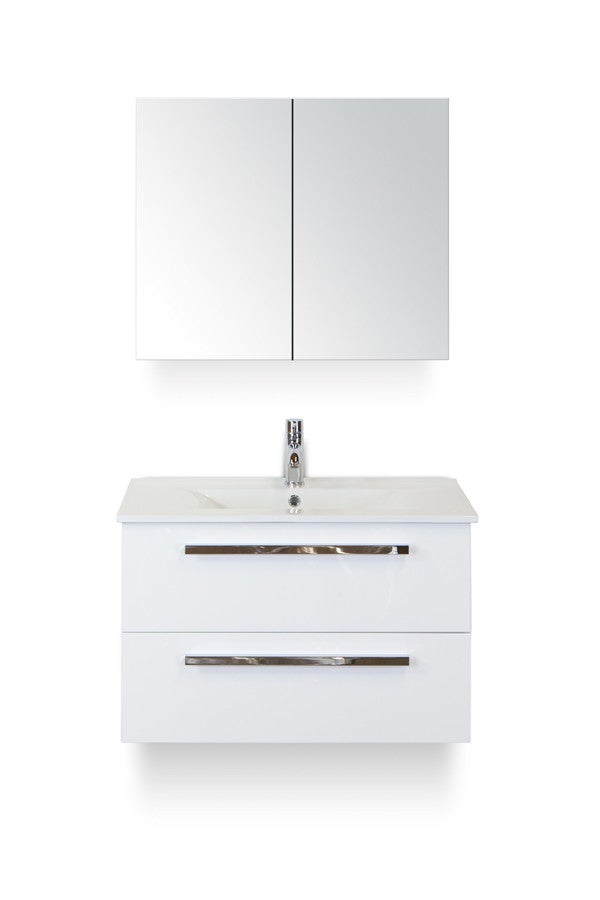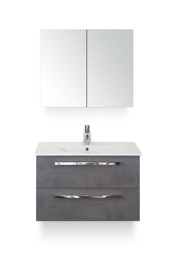 Amanda badmeubel 80 cm leverbaar in 5 moderne kleuren gecombineerd met een dun keramisch wastafelblad en spiegelkast dubbelzijdig gespiegeld (kraan niet inbegrepen).