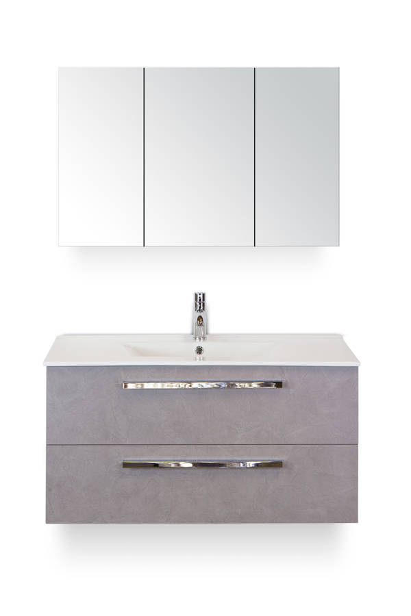 Amanda badmeubel 100 cm leverbaar in 5 moderne kleuren gecombineerd met een dun keramisch wastafelblad en spiegelkast dubbelzijdig gespiegeld (kraan niet inbegrepen).