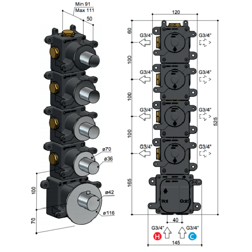 Hotbath Mate MHR2 High Flow thermostaat met 4 ronde stopkranen en ronde achterplaat, hierdoor zijn 4 onderdelen onafhankelijk van elkaar of tegelijk te bedienen.