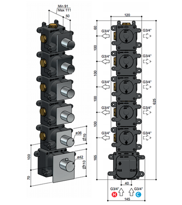 Hotbath Mate MHRQ5 High Flow thermostaat met 5 ronde stopkranen en vierkante achterplaat, hierdoor zijn 5 onderdelen onafhankelijk van elkaar of tegelijk te bedienen.